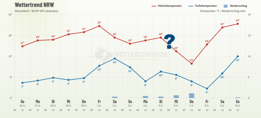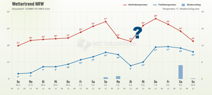 Mit dieser Modelllösung wären dann gegebenfalls auch die ersten frühsommerlichen Temperaturen um 25 bis 28 Grad möglich. Auch das Schauer- und Gewitterrisiko steigt zum Wochenende hin etwas an, so dass es dann gegenfalls örtlich auch mal etwas Regen geben könnte. Wo genau es nass werden könnte, lässt sich aber noch nicht vorhersagen.