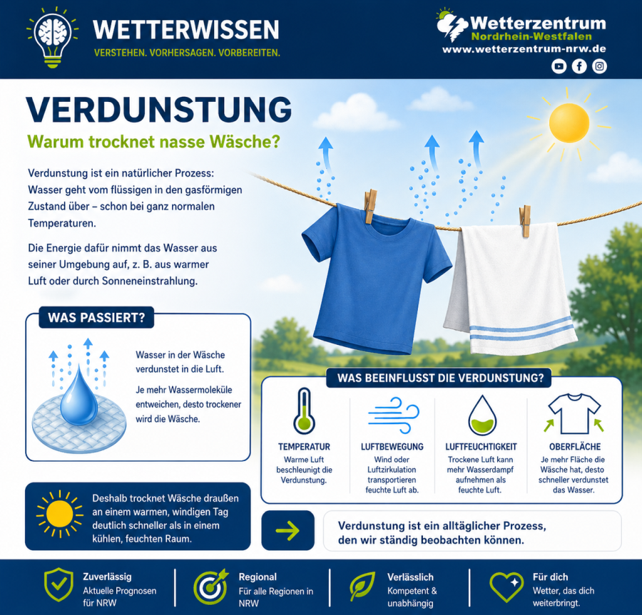 Einmal kurz und einfach erklärt: Verdunstung ist ein physikalischer Prozess, bei dem Flüssigkeit in den gasförmigen Zustand übergeht – also von Wasser zu Wasserdampf. Das ganze ist ein ziemlicher komplexer Vorgang, wir beschränken uns hier in diesem Beitrag deshalb auf diese vereinfachte Begriffserklärung. Ein anschauliches Beispiel ist – wie oben bereits erwähnt – das Trocknen von nasser Wäsche: Nach dem Waschen bleibt Wasser in den Textilfasern zurück. Dieses Wasser verdunstet nach und nach und wird in die umgebende Luft abgegeben. Dafür benötigen die Wassermoleküle Energie, die sie aus ihrer Umgebung aufnehmen – zum Beispiel aus der warmen Luft oder durch Sonneneinstrahlung. Ein weiteres Beispiel aus unserem Alltag ist unser eigener Körper: Auch auf der menschlichen Haut findet ständig Verdunstung statt. Wenn wir schwitzen, bildet sich ein dünner Wasserfilm auf der Haut. Dieses Wasser verdunstet und entzieht dabei der Haut Wärmeenergie. Genau deshalb wirkt Schwitzen kühlend – ein natürlicher Mechanismus unseres Körpers, um die Körpertemperatur zu regulieren. |